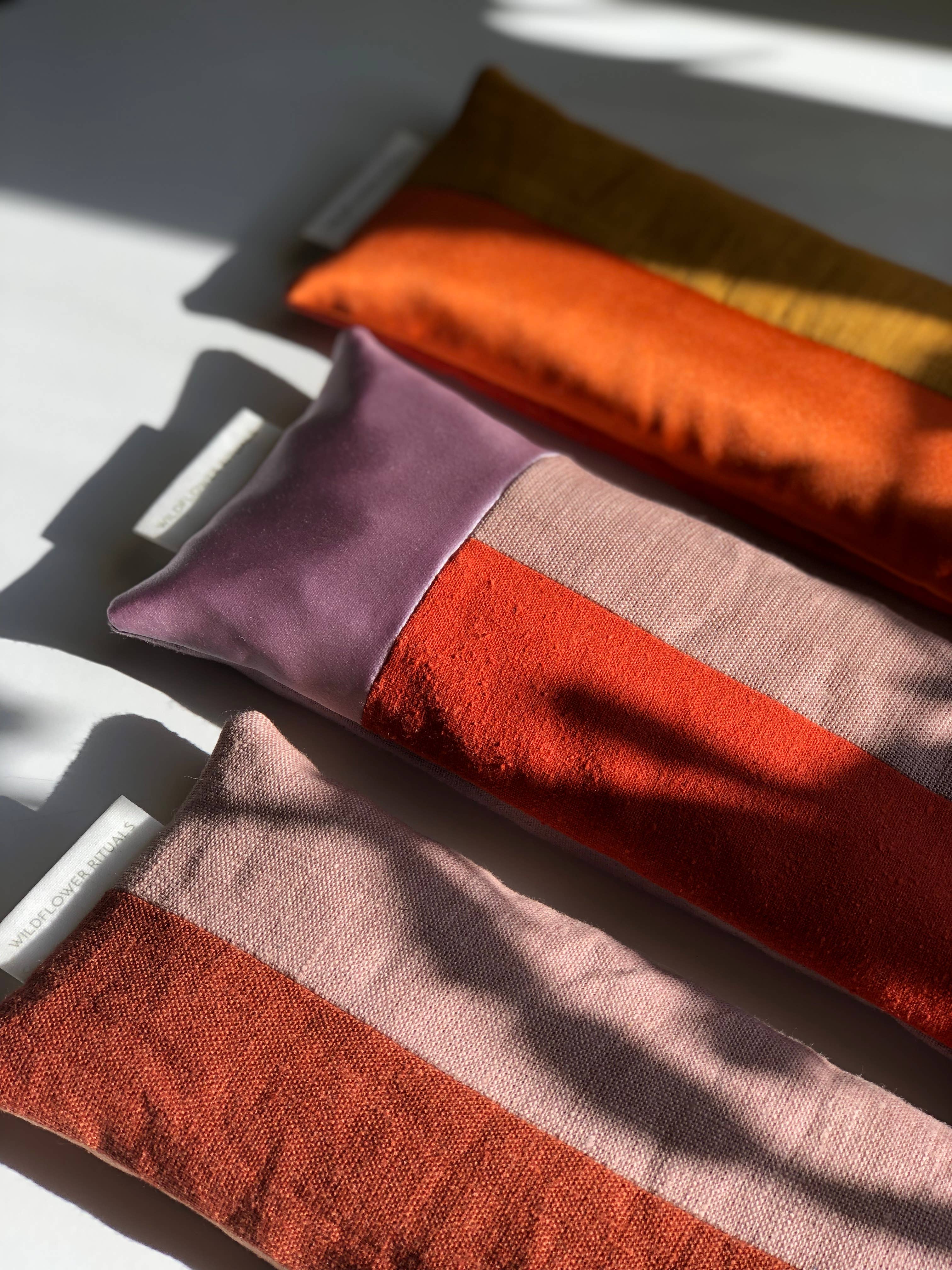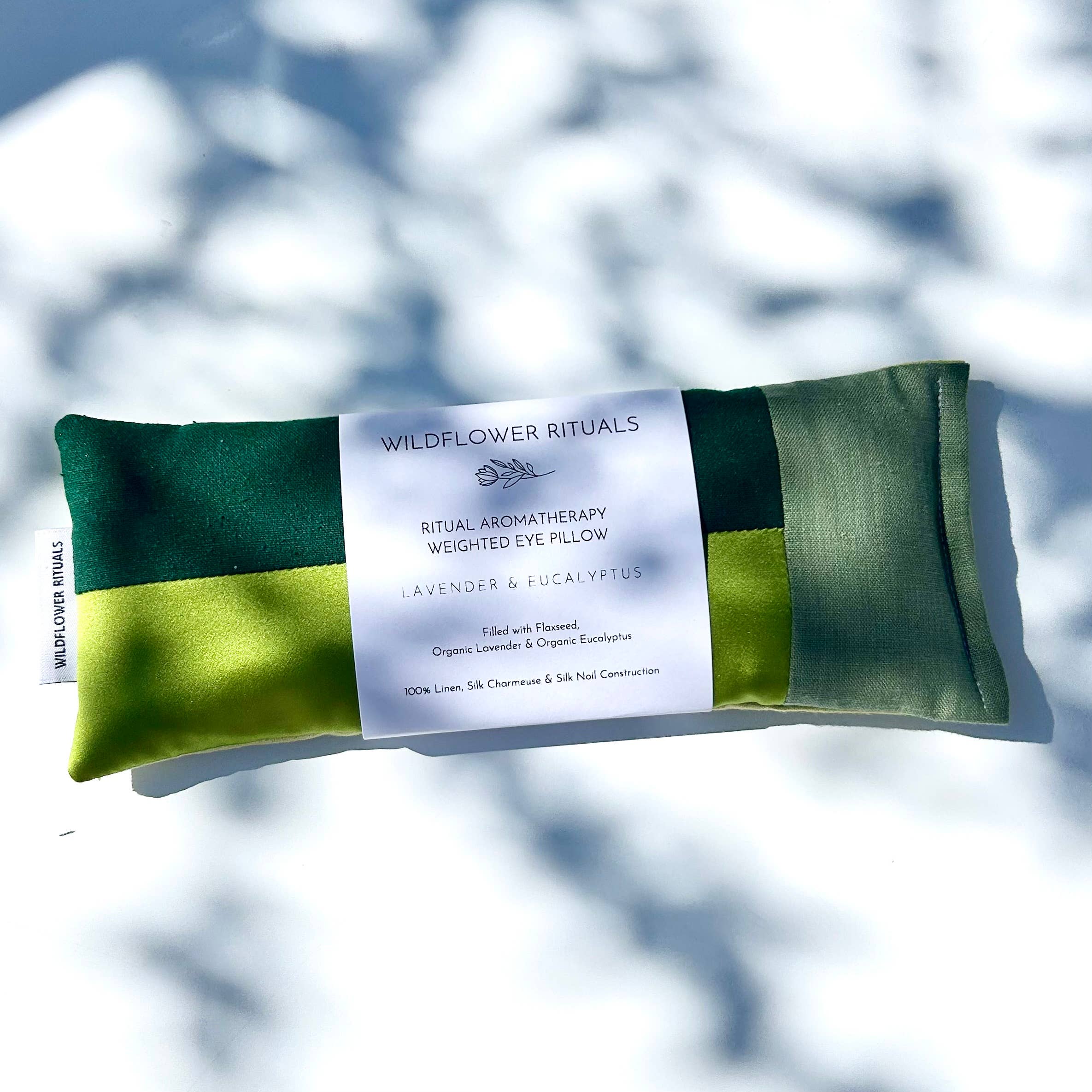 Elevate your self-care routine with an aromatherapy weighted eye pillow. Constructed of Linen, Silk Noil & Silk Charmeuse, these luxurious pillows, with unique patchwork design, are made to calm your mind, body & senses. Each pillow is filled with flax seed, lavender & eucalyptus for a gentle weight & soothing aroma. Key Features: Weighted Comfort: The perfect balance of weight provides a calming sensation, relieving tension around the eyes & forehead Aromatic Escape: Enjoy the clearing scent & calming benefits of lavender & eucalyptus Soft & Sustainable: Made with soft, eco-friendly fabrics Versatile Design: Ideal for relaxation, meditation, headache remedy, or winding down after a long day Whether seeking better rest, stress relief, or a moment of serenity, the aromatherapy eye pillow is the perfect companion Great for Fall & Holiday 2025 displays! How To: Place over the eyes while you lay back. Pillow can be gently heated on low for approx. 20-30 seconds to warm, or placed in the refrigerator fo